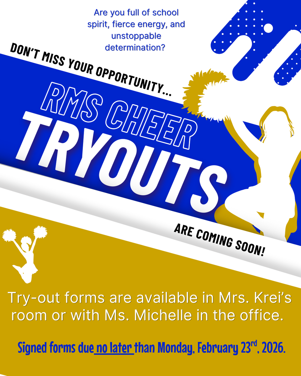 Middle school cheer is open to 6th and 7th grade students. Tryout forms can be picked up in the office or from Mrs. Krei. The forms state that the deadline for signing up is Friday, Feb. 20th. Howe...